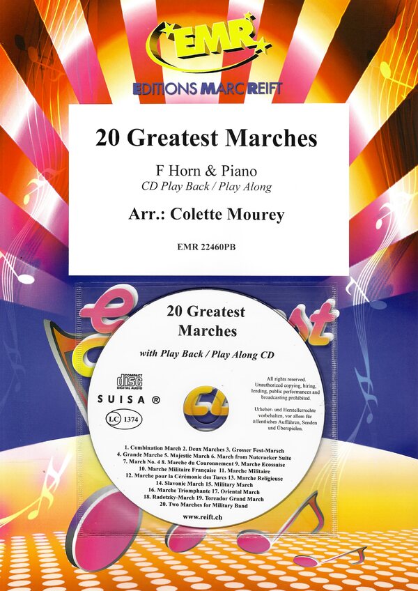 1. Combination March (Joplin) / 2. Deux Marches from Le Carnaval de Venise (Campra) / 3. Grosser Fest-Marsch (Wagner) / 4. Grande Marche from Trois Grandes Marches (Czerny) / 5. Majestic March (Joplin) / 6. March from Nutcracker Suite (Tchaikovsky) / 7. March No. 4 from Pomp And Circumstance (Elgar) / 8. Marche du Couronnement from Le Prophète (Meyerbeer) / 9. Marche Ecossaise (Debussy) / 10. Marche Militaire Française from Suite Algérienne (Saint-Saëns) / 11. Marche Militaire from Trois Marches Militaires (Schubert) / 12. Marche pour la Cérémonie des Turcs from Le Bourgeois Gentilhomme (Lully) / 13. Marche Religieuse (Guilmant) / 14. Slavonic March (Tchaikovsky) / 15. Military March (Granados) / 16. Marche Triomphante from David et Jonathas (Charpentier) / 17. Oriental March from Seis Piezas Sobre Cantos Populares Españoles (Granados) / 18. Radetzky-March (Strauss) / 19. Toreador Grand March from Carmen (Bizet / Maylath) / 20. Two Marches for Military Band (Beethoven)