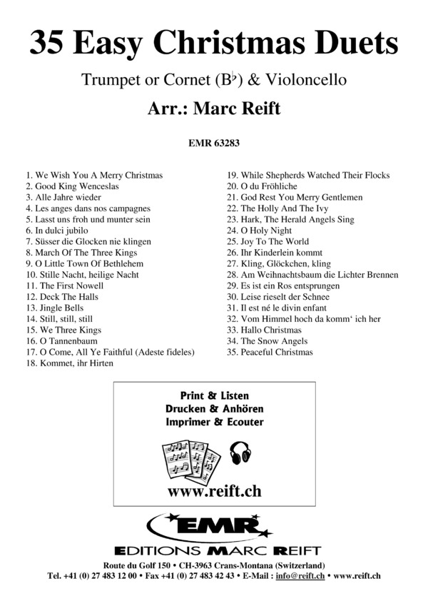 1. We Wish You A Merry Christmas 2. Good King Wenceslas 3. Alle Jahre wieder 4. Les anges dans nos campagnes 5. Lasst uns froh und munter sein 6. In dulci jubilo 7. Süsser die Glocken nie klingen 8. March Of The Three Kings 9. O Little Town Of Bethlehem 10. Stille Nacht, heilige Nacht 11. The First Nowell 12. Deck The Halls 13. Jingle Bells 14. Still, still, still 15. We Three Kings 16. O Tannenbaum 17. O Come, All Ye Faithful (Adeste fideles) 18. Kommet, ihr Hirten 19. While Shepherds Watched Their Flocks 20. O du Fröhliche 21. God Rest You Merry Gentlemen 22. The Holly And The Ivy 23. Hark, The Herald Angels Sing 24. O Holy Night 25. Joy To The World 26. Ihr Kinderlein kommt 27. Kling, Glöckchen, kling 28. Am Weihnachtsbaum die Lichter Brennen 29. Es ist ein Ros entsprungen 30. Leise rieselt der Schnee 31. Il est né le divin enfant 32. Vom Himmel hoch da komm' ich her 33. Hallo Christmas 34. The Snow Angels 35. Peaceful Christmas