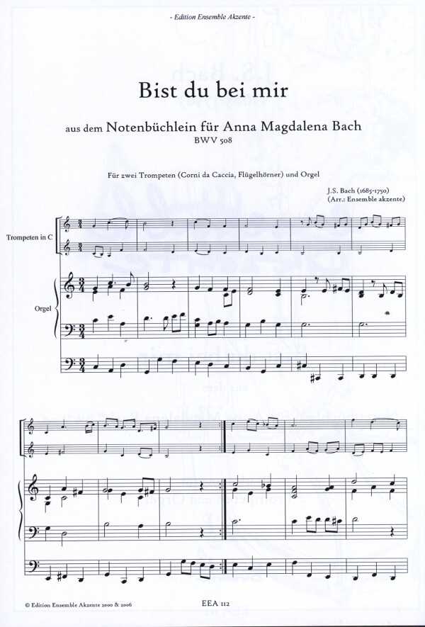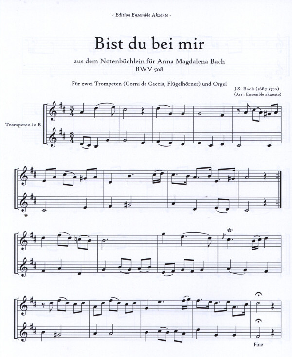 (aus dem Notenbüchlein für Anna Magdalena Bach BWV 508, auch mit Corno da Caccia oder Flügelhorn spielbar, Stimmen in C oder B) für 2 Trompeten + Orgel