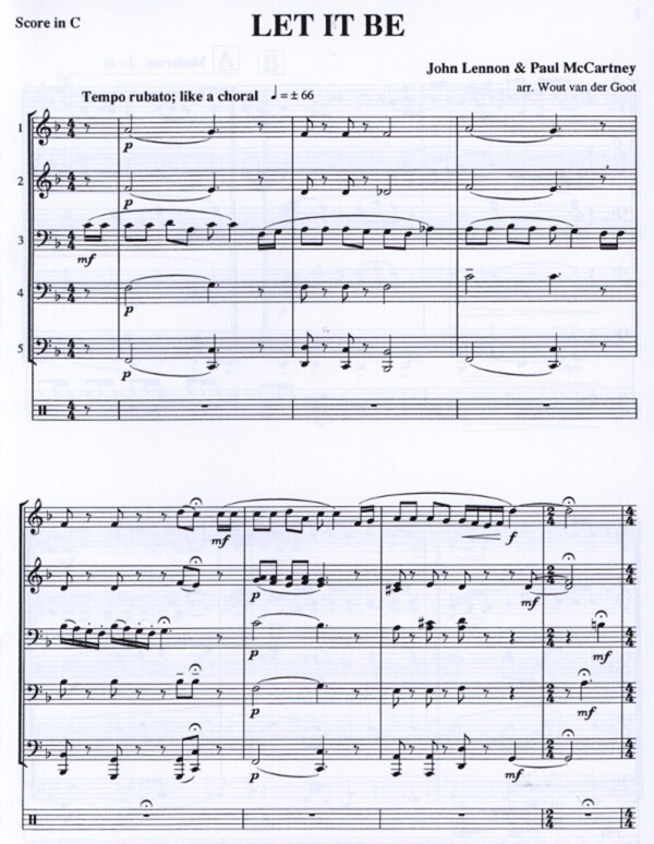 4. Stimme in C im Baßschlüssel, B im Violin-/Baßschlüssel 5. Stimme in C im Baßschlüssel, B/Es im Baß-/Violinschlüssel + Schlagzeug ad lib.