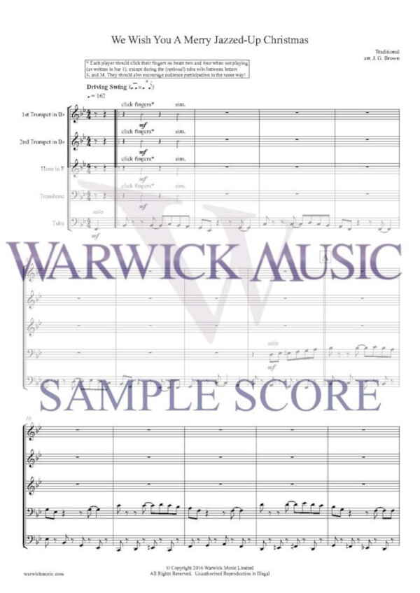 We Wish You A Merry Jazzed-Up Christmas was first written in 2002 for an open air carol service in Altrincham, Cheshire. It underwent a number of further revisions in the following years, becoming very popular at Altrincham Boys Grammar School with both performers and audience alike. It was played at school concerts and also at the end of a carol service, where it was supposed to be used as exit music, but when we finished playing it, all the boys were still sat in their places, as they had been enjoying the music so much!