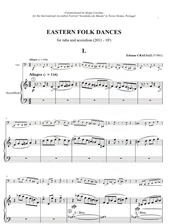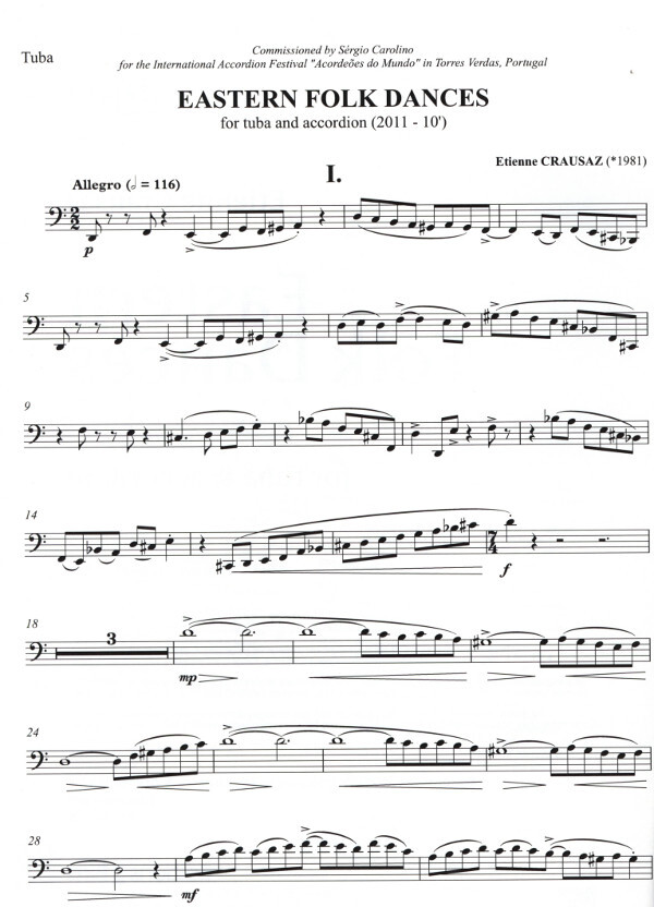 These dances for tuba and accordion (or piano, ref. TU176) are inspired by the unique atmosphere of Balkan popular music, namely its lively nature, use of compound rhythms as well as the melancholic and nostalgic character.