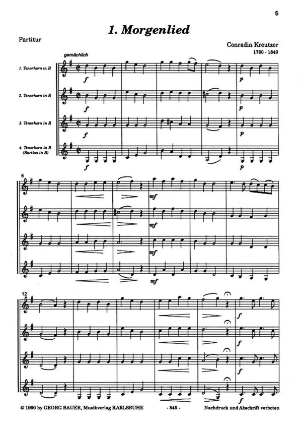 a= Hef t 1 (mit: Kreutzer: Morgenlied - Pohlenz: Jägers Morgenlied - Maier: Requiem - Löwe: Ballade - Volkmann: Liebeslied - Silcher: Durch's Wiesetal) b= Heft 2 (mit: Rissius: Lustige Musikanten - Reinecke: Trinklied - Silcher: Sanctus - Schubert: Trauermusik - Volkmann: Abendlied - Fröhlich: Vom Trinken)