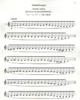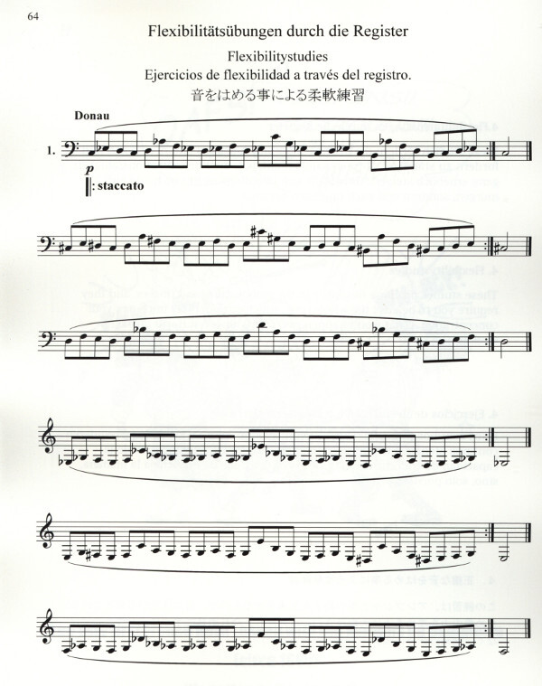 Dudelübungen, Einblasübungen, Stoß- und Bindungsübungen, Flexibilitätsübungen durch die Register, Intervallübungen, Tonleiter- und Arpeggioübungen.