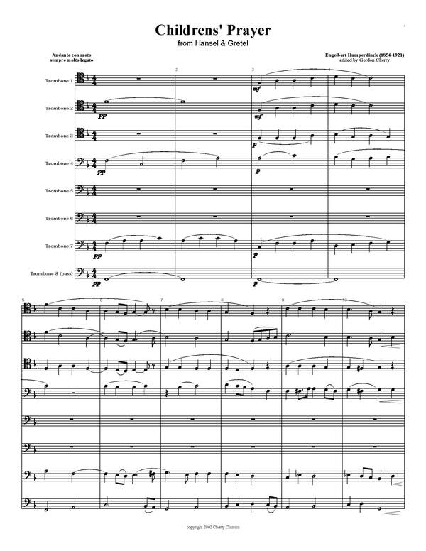 Transcribed by retired Principal Trombonist of the Vancouver Symphony, Gordon Cherry. This work is for 8 trombones, and is taken from the famous scene in the opera when the children say a prayer before going to sleep in the deep forest. This work has a very beautiful sound and shows off the legato and expressive qualities of the trombone choir.This transcription is very tastefully done, with minimal editing of dynamics and phrasing.