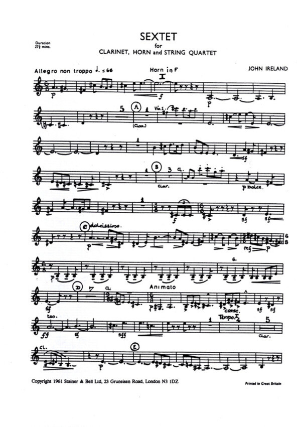 1961 komponiert 4 Sätze 28 Min. für Horn in F Klarinette in A + Streichquartett (2 Violinen, Viola + Violoncello)