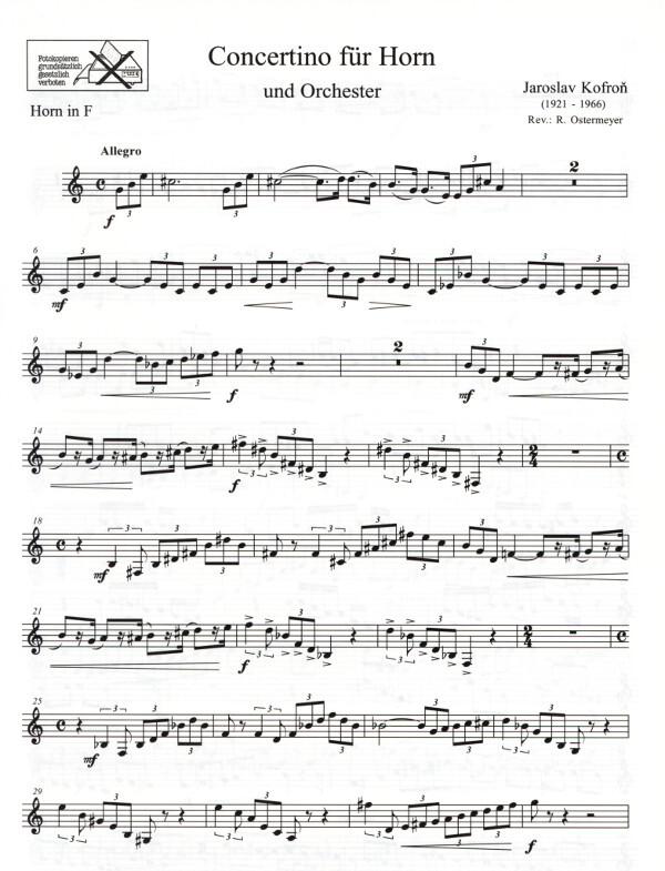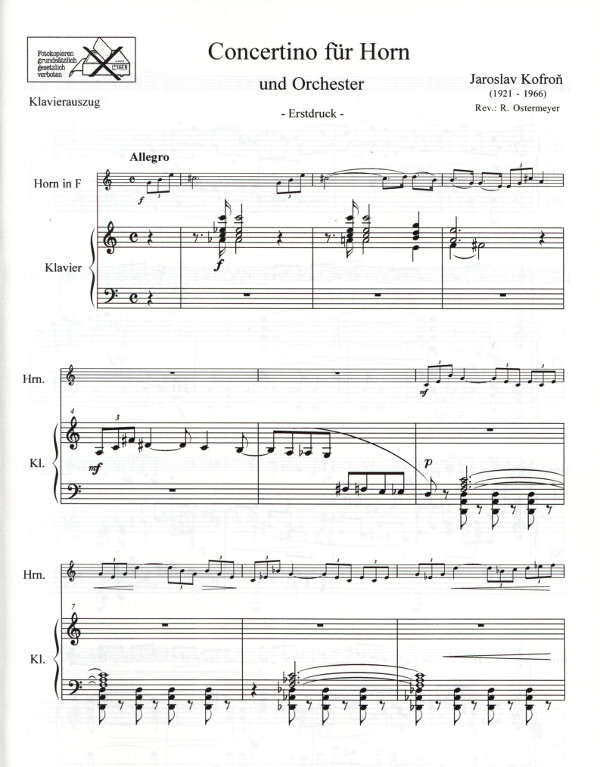 Jaroslav Kofron (1921 - 1966) dürfte der Hornistenwelt alleine durch seine Sonatine für Horn und Klavier (1952) bekannt sein. Sein hier im Erstdruck vorgestelltes Concertino für Horn, welches um 1960 entstanden ist, ist weithin unbekannt. Zu Unrecht!