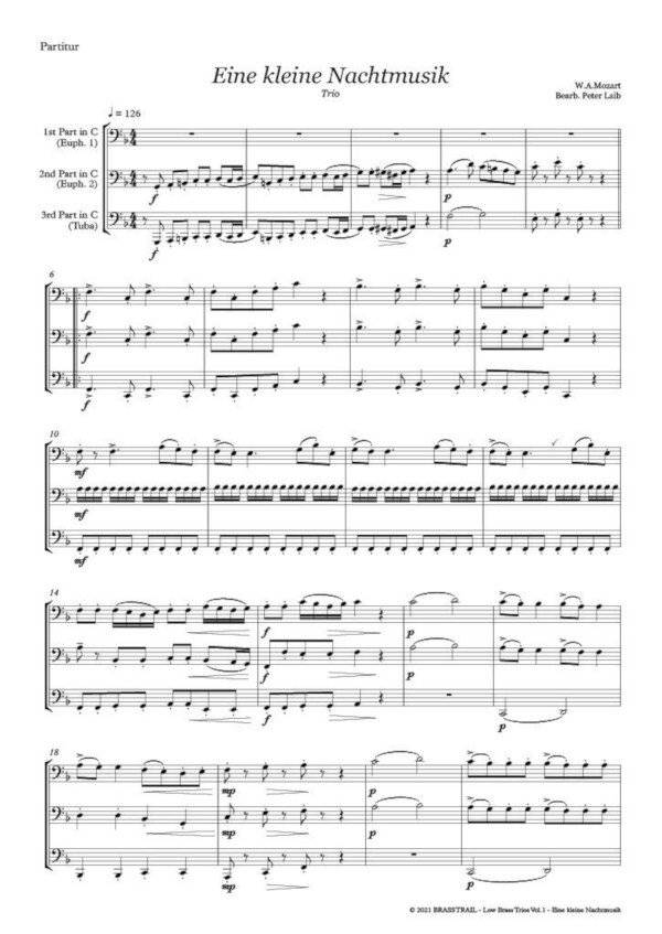 Low Brass Trios Vol.1 enthält 2 klassische Trios für Bariton, Euphonium & Tuba, arrangiert von Peter Laib. Mit Arioso & Eine kleine Nachtmusik haben wir 2 Klassiker ausgewählt, deren Solostimmen ebenfalls in unserer Bläserschule zu finden sind.