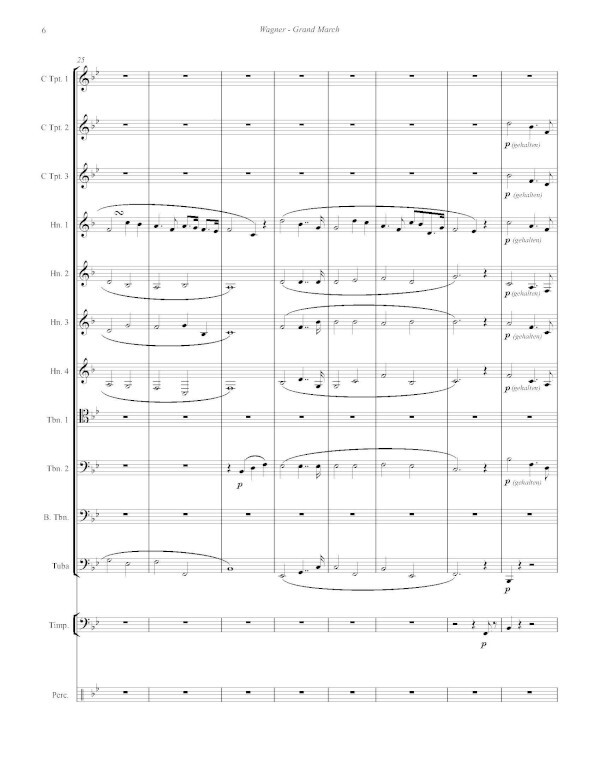 Richard Wagner wrote his great opera Tannhäuser in 1845. The famous Grand March occurs in Act II, Scene 4, as Elizabeth and Landgrave watch guests arrive for the Sängerkrieg (Song Contest). The Grand March, also known as the "Entrance of the Guests" features an exciting fanfare with magnificent choral-style writing that has been beautifully arranged for 11-part Brass Ensemble with Timpani and Percussion by Thomas Jöstlein. It is appropriate for advanced performers.